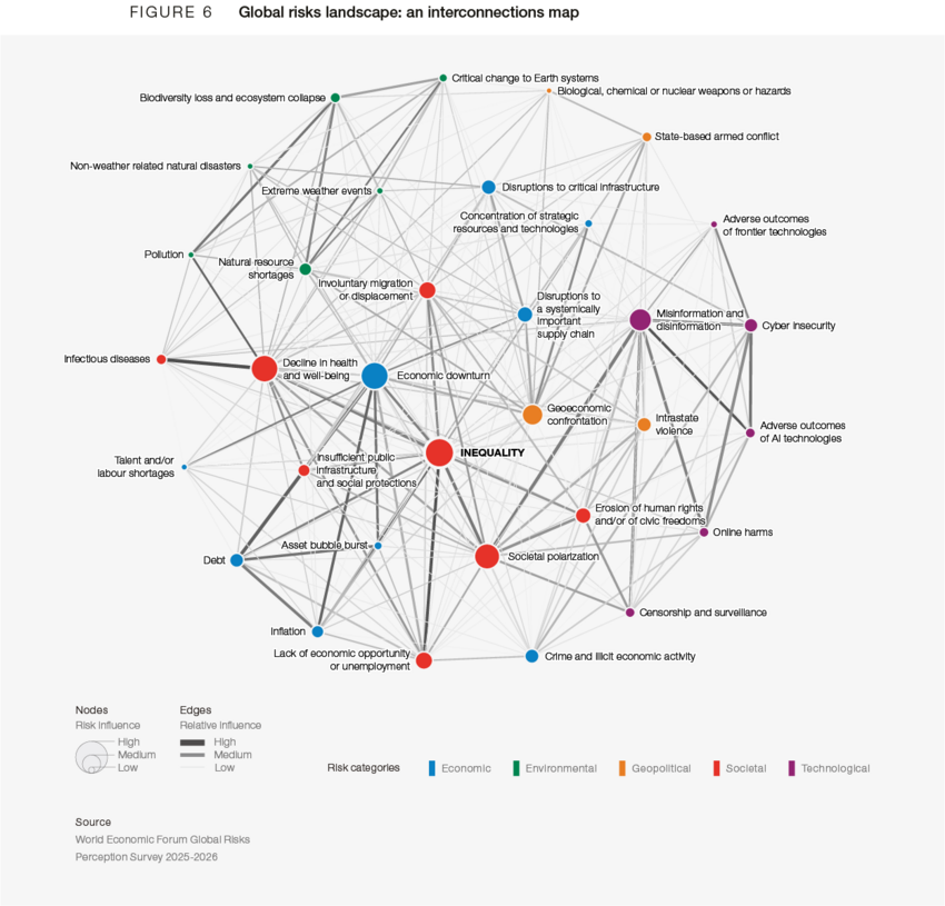 2026年の即時的リスクとして、回答者の最大の懸念は地政学的経済対立で、18%がこれを選択している。国家間武力紛争が14%で続き、極端気象が8%、社会的二極化と偽情報・誤情報がそれぞれ7%で並ぶ。経済減速が5%、人権・市民的自由の侵食が4%、AI技術の悪影響が4%、サイバーセキュリティが3%、不平等が3%と続く。