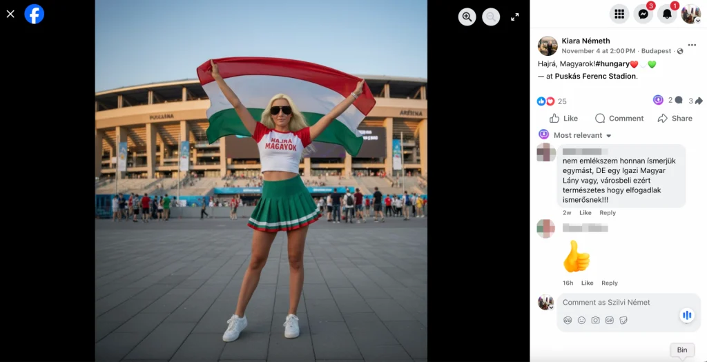 加えて、thirst trap(性的な関心を引く意図で投稿される誘惑的な写真)を使ったフレンド獲得戦術も文書化されている。プラチナブロンドの「Tamara」「Vanessza」「Fanni」らは外見的魅力を前面に出した写真を投稿して友人申請の成功率を高め、Tamaraはそのネットワークを使って11月7日にオルバーン=トランプ会談関連の動画を13本流通させた。「Bertalan」は木々と犬の写真によって実在ユーザーの申請受諾を引き出した事例として記録されている。婚活目的の公開グループ(3万3,000フォロワー)への投稿も確認された。別の「Zoltán」がAI生成と見られる写真に「友達申請してくれたら話しかけます!」と添えて投稿し、1,100件のいいねと200件近いコメントを獲得したが、同アカウントが別のネットワークメンバーと同一のプロフィール写真を過去に使用していたことも判明している。Facebookでは近年こうした婚活グループが急増しており、プラットフォームのアルゴリズムは加入していないユーザーにもグループのコンテンツを推薦するため、意図せず偽プロフィールのコンテンツに触れる入り口として機能している。