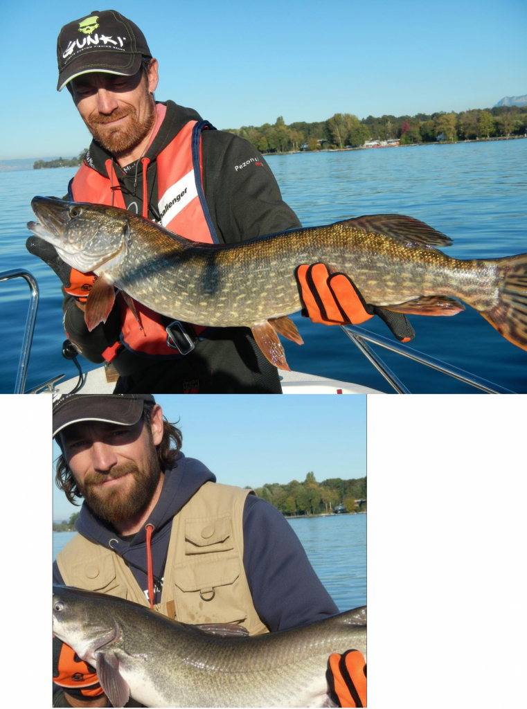 上段が元の写真(レマン湖のスポーツフィッシング講師)、下段がAIで改変されたÁgostonのプロフィール写真。髪の色・長さが変えられている。出典:Facebook / Lakmusz