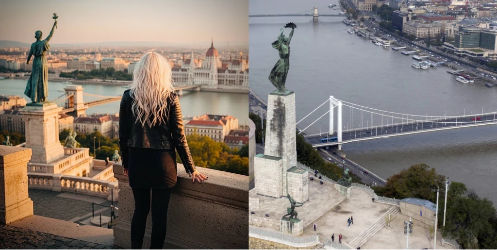 地理的・建築的エラーはAI生成の典型的な痕跡として機能する。「Emma」の投稿では実際には自由橋ではなく鎖橋がブダ城方向に向かって描かれており、「Kiara」のプロフィール写真は国会議事堂・鎖橋・自由の女神像という互いに視野内に収めることが地理的に不可能な3つのランドマークを一枚の画像に圧縮している。自由の女神が手にしているのは元の像の銅製の花ではなく、勝利と平和を象徴する棕梠の枝に差し替えられている。