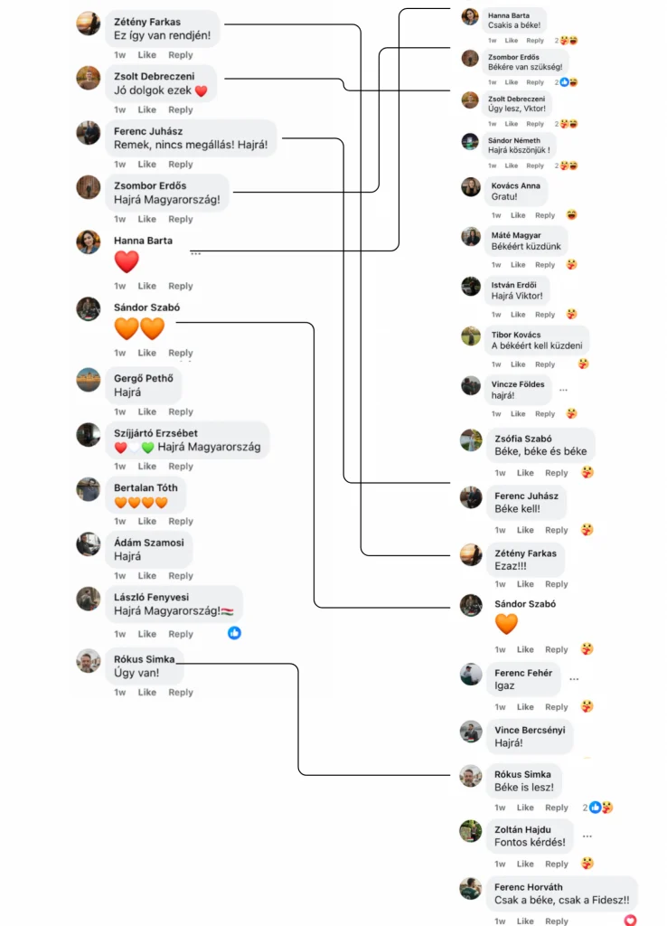 ネットワークの運用パターンを最も鮮明に示すのが、2025年11月7日のオルバーン=トランプ会談報道への反応である。「Cintia」は同日18時30分から22時30分の4時間に25本の短動画を投稿し、「Mihály」はその同じ日に39本を投稿した。投稿間隔が2分しかない場合でも、Zsombor Erdős、Ferenc Juhász、Zsolt Debreceniら同じネットワークメンバーが一貫してコメントを継続した。こうした投稿は最大で2,000〜4,500件の反応を集め、2週間で1,000件以上の政治的投稿がネットワーク全体から生成されたとLakmuszは推計している。